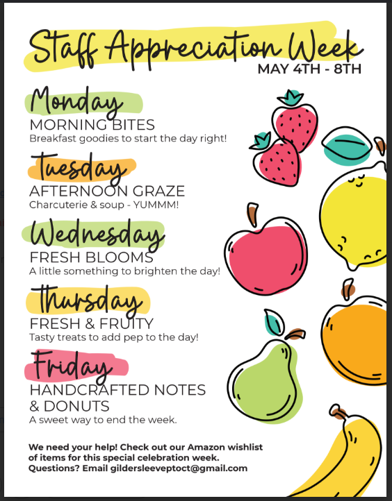 We have an amazon wishlist, signup genius and donate a donut links to help make the week wonderful for our incredible Gildersleeve community.